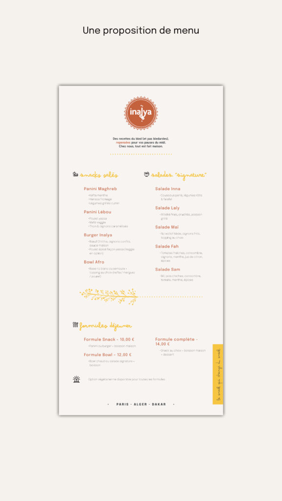 Nous avons repositionné Inalya comme un snack maghrébo-africain moderne, fusionnant les saveurs du Maghreb et de l’Afrique de l’Ouest, avec un slogan : « Le snack qui change du snack ».